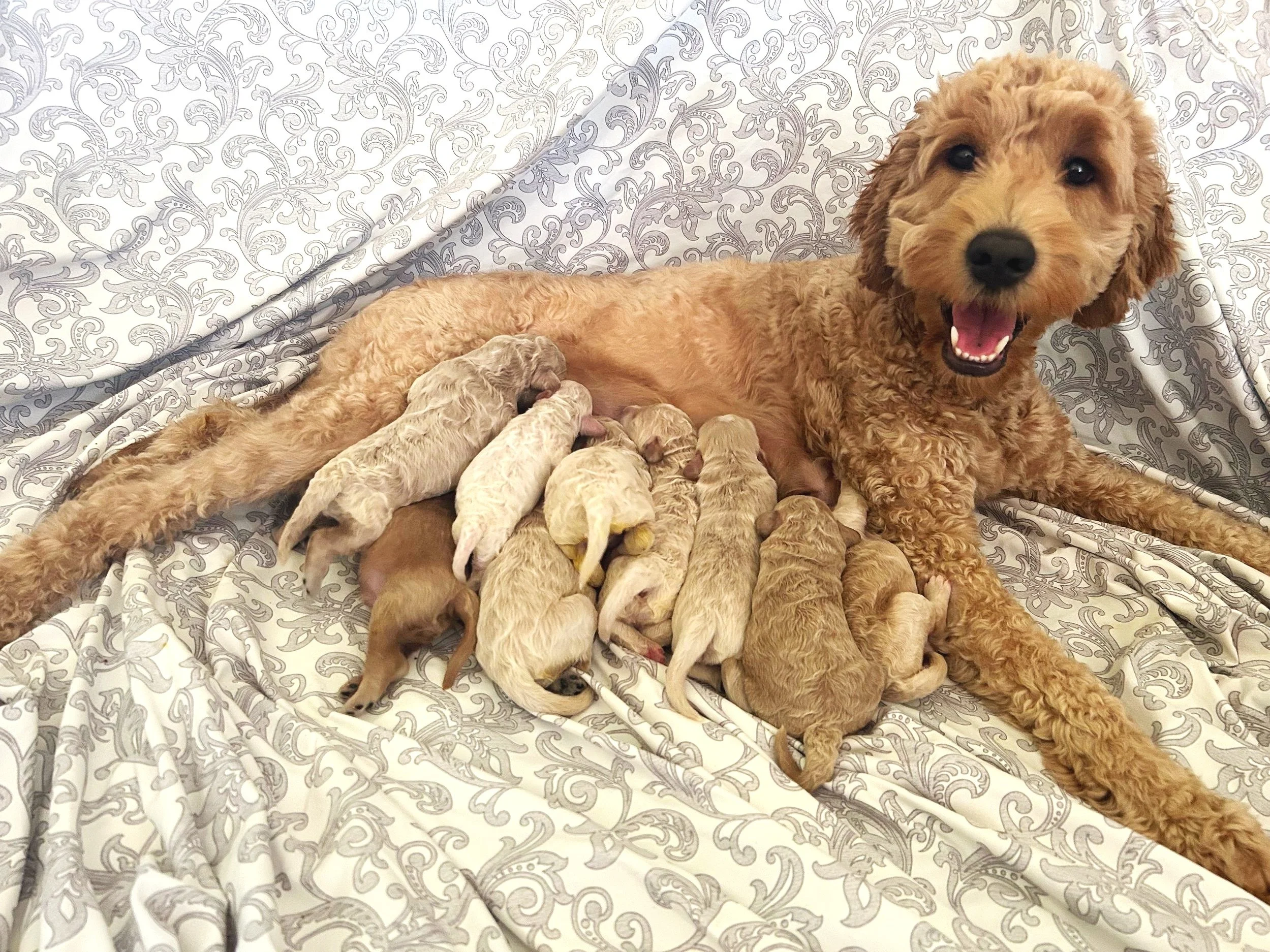 Muffin is our beautiful tan multigenerational mini Goldendoodle. She has a wonderfully sweet, gentle, and playful temperament.